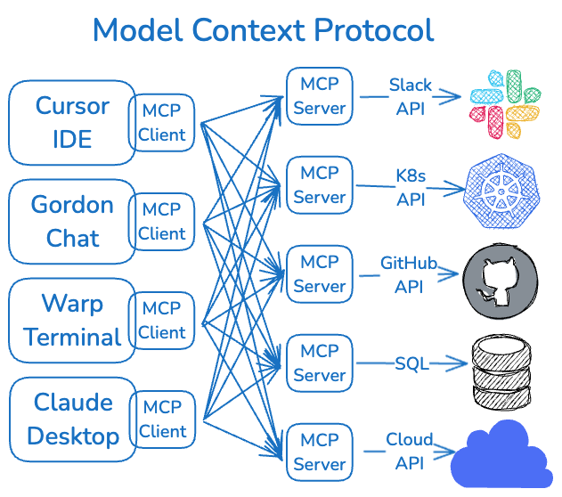 Second, the MCP (Model Context Protocol) was released by Anthropic as their idea for how models (LLMs) could access tools and data. It allows a model to understand the functions that tools could perform, and, most importantly, execute those functions (or retrieve the data in a human-readable way). I hate to call MCP a standard yet, but its popularity took off so fast as the only universal way to get models and tools working together, it's the de facto standard just 6 months later. Every tool out there, including AWS's APIs, GitHub's APIs, Kubernetes, IDEs, and many CLIs, already have MCPs. Think of MCP as a proxy between the LLM and the tool/API you want it to control. It allows the LLM to interact with any external tool/API in a common way.
