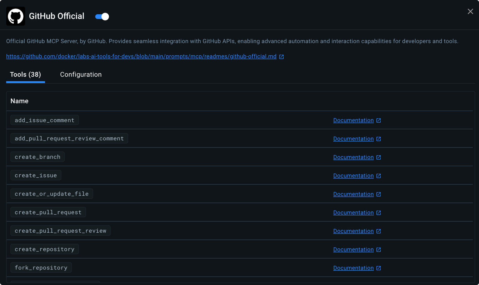 - Open the extension and enable some of your favorite tools. Notice how you can click the little blue box to see a list of tools (capabilities) that the MCP Server supports. These are the actions you can tell an LLM to take. I'll add the GitHub one after giving it a PAT to access the GitHub API.
