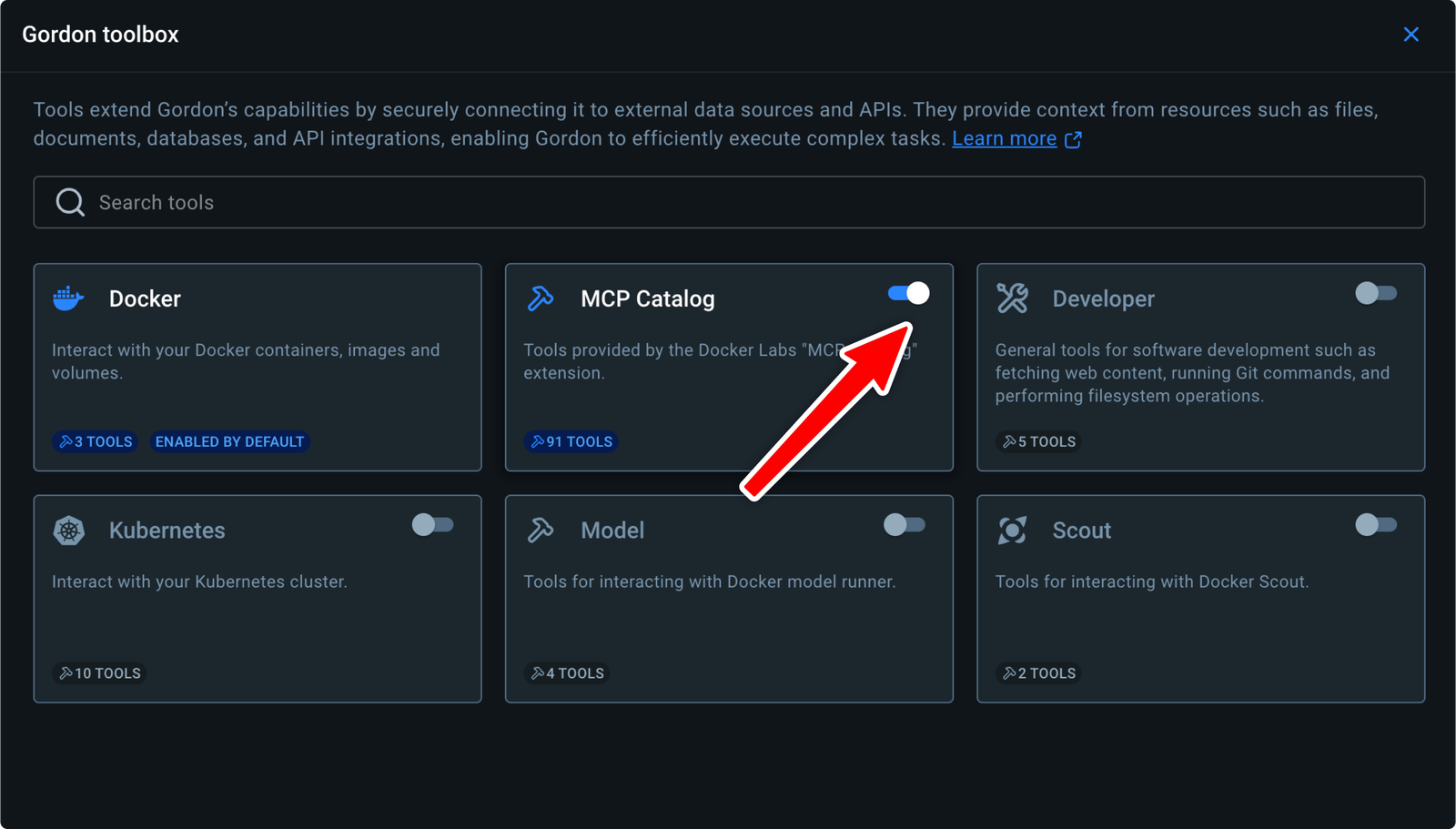 - Now we need to connect those MCP Servers to a "MCP Client", which is something with an LLM, like Cursor, Claude Desktop, or the easiest is to enable the Gordon AI. Gordon is now an MCP Client and comes out of the box knowing how to control Docker, but it also has other tools in its toolbox. Click the little tool hammer in the Gordon chat box and turn on "MCP Catalog", which gives it all the tools you've enabled in the MCP Toolbox extension.