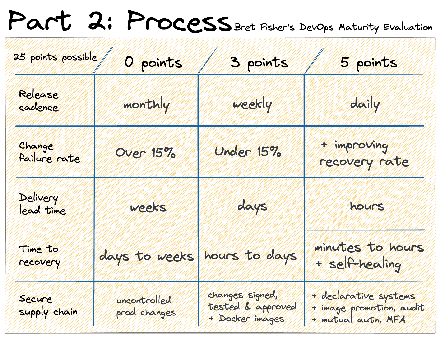 I’ve created a mini-evaluation for you to do right now. I’m calling it Bret’s DevOps Maturity Evaluation. B-DOME for short, hah! For each of the three topic areas, there are five questions with up to 75 points across the evaluation. For each question, I give you three basic choices: