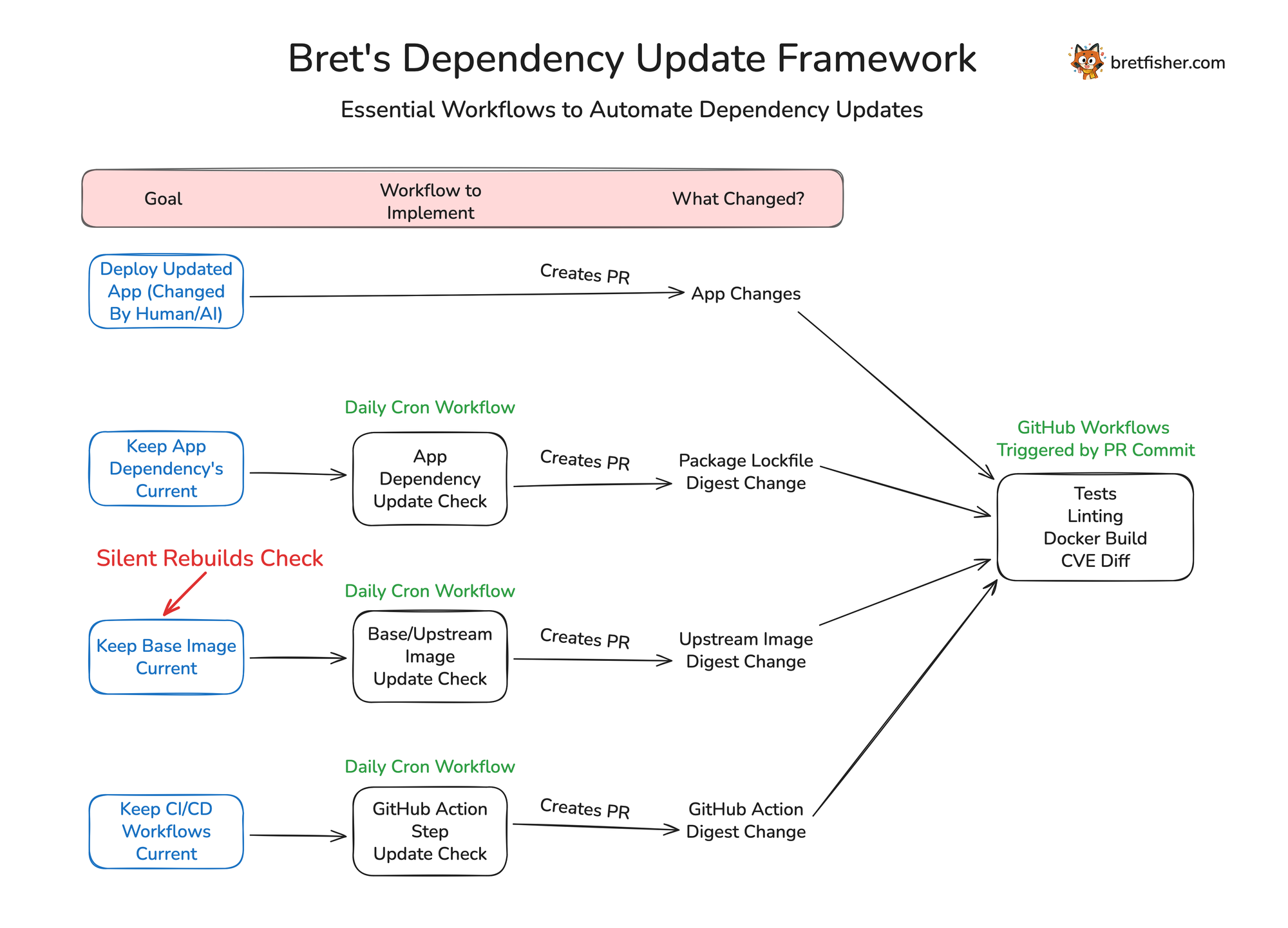 CI systems are as unique as the code they build. Sometimes, trying to compare how two orgs design their workflows and automations is like comparing works of art, but there are some common essentials that I focus on as a baseline for what every team should be doing. Part of that I’m calling “Bret’s Dependency Update Framework”