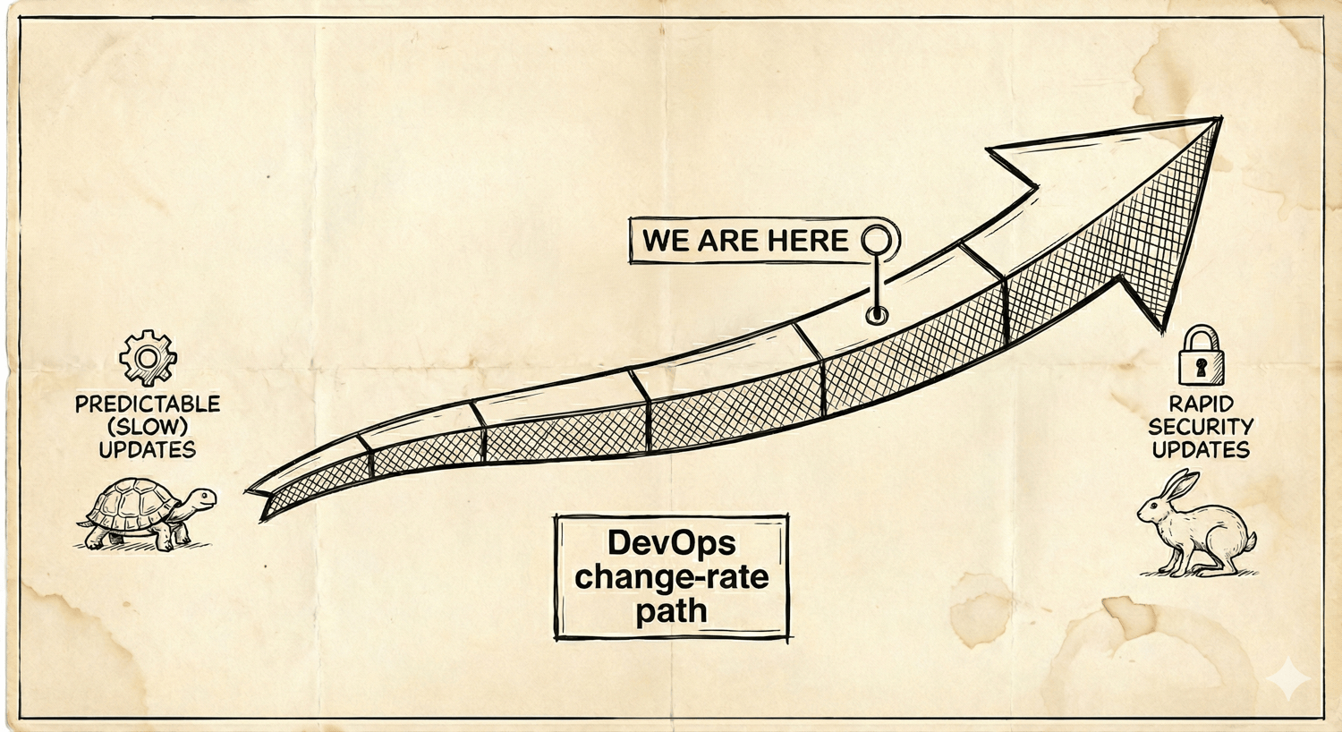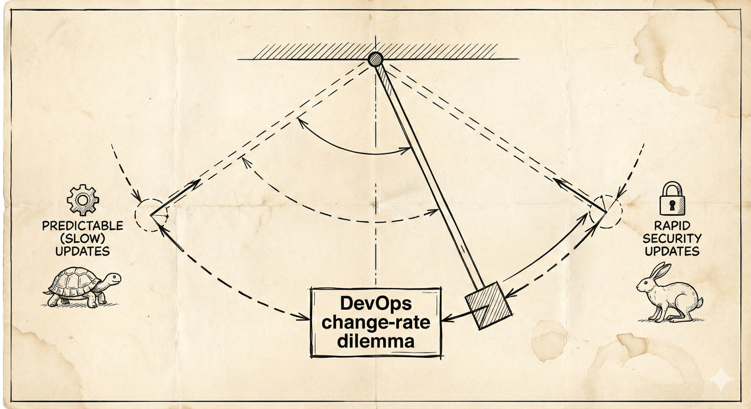 This is part of what I call the “DevOps change-rate dilemma.” DevOps metrics track this as “Change failure rate” and “Lead time for changes,” which can seem to be at odds with each other. We strive for predictable and deterministic updates that can be clearly controlled, but we (should) also want to deploy updates as fast as possible (particularly when it’s a security fix). You might think of it as a pendulum where we have full change control on one side (tracked as a change failure rate) and fast changes on the other side (tracked as lead time for changes), and never the two shall meet. Moving toward one might have you thinking you're hurting the other.