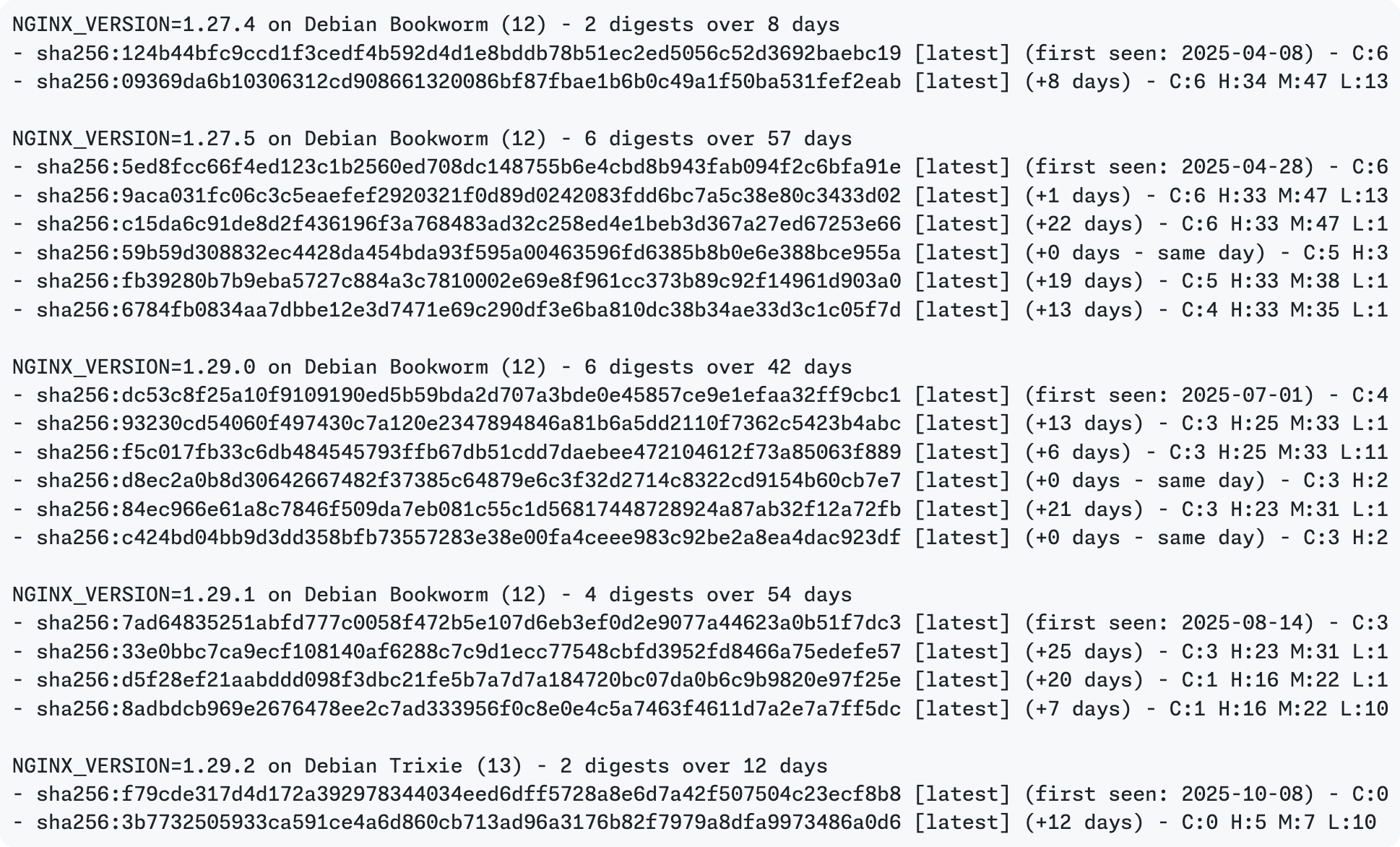 My friend Eric Smalling, a Chainguard engineer and Docker pro, and I spent a week tracking down the history of tags for a few popular official images and all of them had 2-6 Silent Rebuilds per tag. We stored them here to document what we’re seeing. Here’s an example of 5 nginx versions showing 20 unique digests: